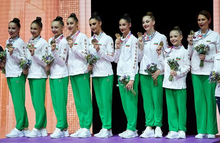 سپین کے والنسیا میں 40ویں ایف آئی جی ریتھمک جمناسٹک ورلڈ چیمپئن شپ میں طلائی تمغہ جیتنے والی ٹیم بلغاریہ کی کھلاڑی  ایوارڈ تقریب کے دوران تصویر بنوارہی ہیں۔(شِنہوا)