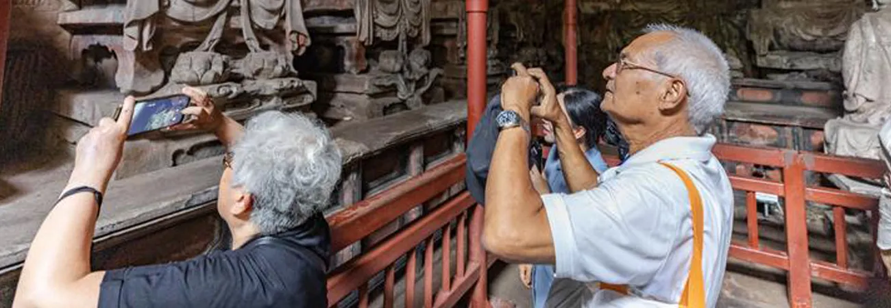 چین، جنوب مغربی شہر چھونگ چھنگ میں سیاح دازو چٹان نقش و نگار کے خوبصورت مقام  کا دورہ کررہے ہیں۔ (شِںہوا)