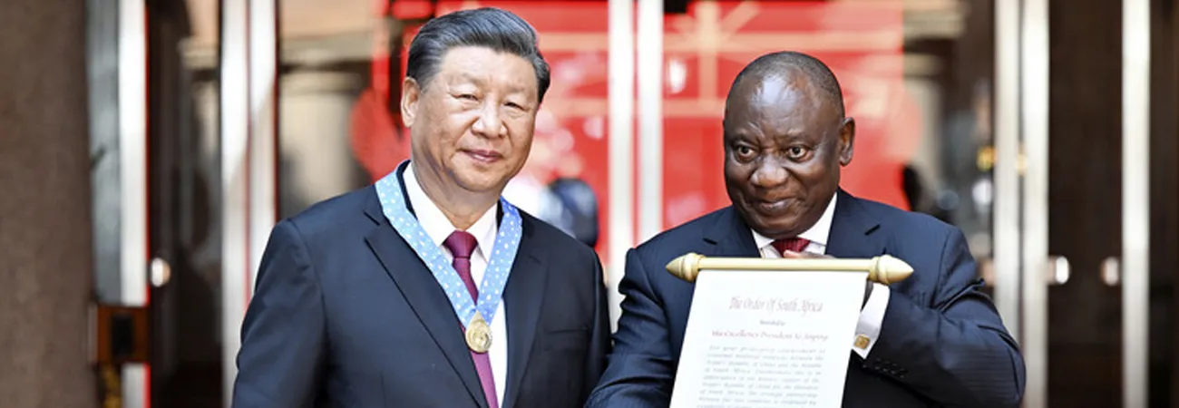 جنوبی افریقہ ، پریٹوریا میں چینی صدر شی جن پھنگ اپنے جنوبی افریقی ہم منصب سائرل رامفوسا سے جنوبی افریقہ کا سب سے بڑا اعزاز آرڈر آف ساؤتھ افریقہ وصول کررہے ہیں۔ (شِنہوا)