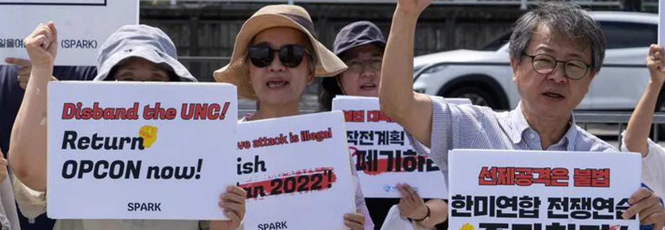 مظاہرین نے "جنگی مشقیں بند کرو" کے نعرے لگائے جنہوں نے "جنوبی کوریا-امریکی جنگی مشقیں بند کرو" اور "جنوبی کوریا-جاپان اتحاد سے انکار" کے نعروں پر مبنی پلے کارڈ اٹھا رکھے تھے۔