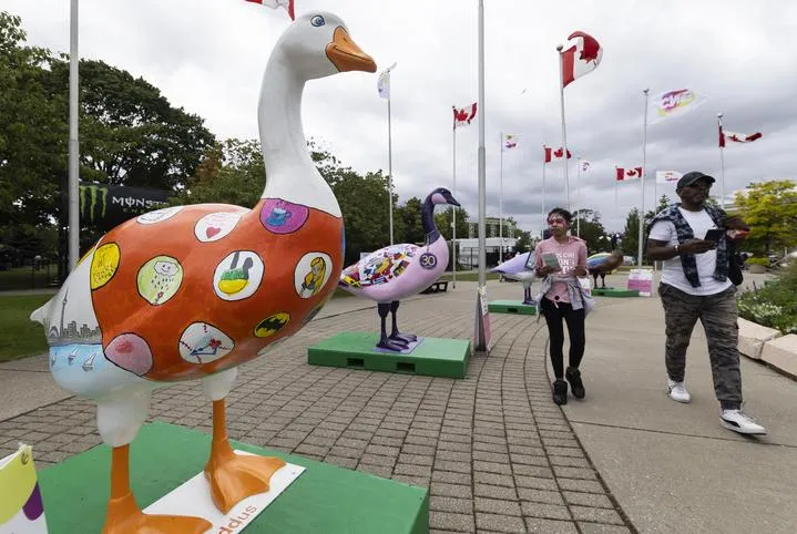 کینیڈا کے شہر ٹورنٹو میں 2023 کینیڈین نیشنل ایگزیبیشن(سی این ای)  کے دوران لوگ ہنس کے مجسموں کے پاس سے گزر رہے ہیں۔(شِنہوا)
