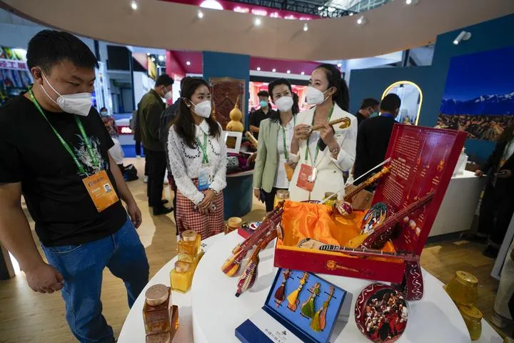 چین ، دارالحکومت بیجنگ کے شوگانگ پارک میں چائنہ بین الاقوامی میلہ برائے تجارتی خدمات 2023 کے ما سکوٹ فویان کو دیکھا جاسکتا ہے۔ (شِنہوا)