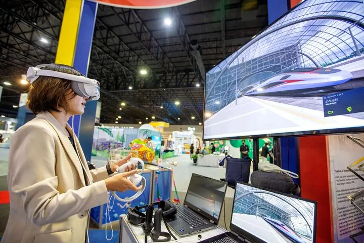 تھائی، بنکاک میں منعقدہ تھائی لینڈ قومی سائنس و ٹیکنالوجی میلے 2023 کے دوران چینی پویلین میں ایک خاتون سیاح وی آرانٹرایکٹو نظام کا تجربہ کررہی ہے۔(شِںہوا)