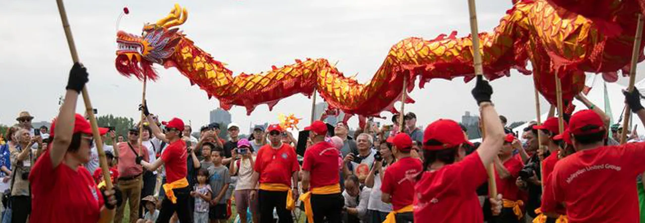 امریکہ ، نیویارک میں منعقدہ ہانگ کانگ ڈریگن کشتی میلہ 2023 کے دوران ڈریگن رقاص فن کا مظاہرہ کررہے ہیں۔ (شِنہوا)