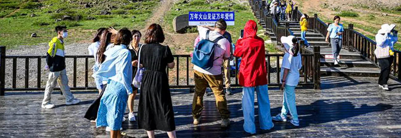چین، شمالی اندرون منگولیا خوداختیار خطے کے اولان چھاب کے چھاہررائٹ ونگ  ریئر بینر میں اولان ہاڈا آتش فشاں کلسٹر میں سیا ح آتش فشاں کے سامنے تصاویر بنارہے ہیں ۔ (شِنہوا)