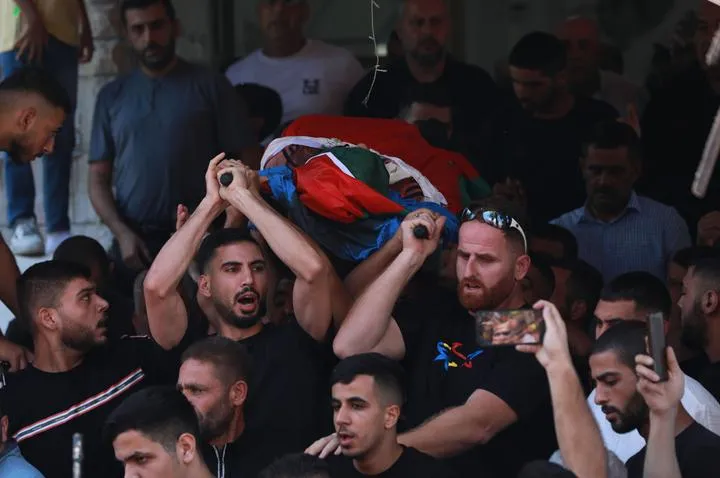 مغربی کنارے کے شہر تلکرم میں سوگوارفلسطینی محمود ابو سعان کی میت تدفین کے لیے لے جا رہے ہیں۔(شِنہوا)
