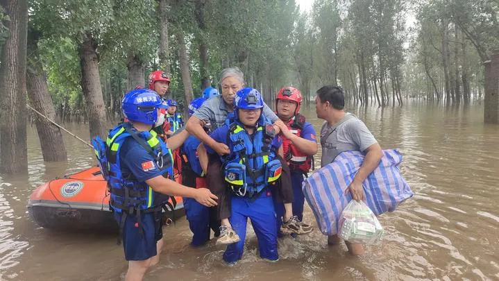 چین کےشمالی صوبہ ہیبی کے شہرژوژومیں امدادی کارکن سیلاب میں پھنسے رہائشیوں کو نکال رہے ہیں۔(شِنہوا)
