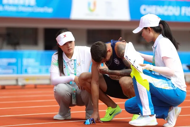 چین کے صوبہ سیچھوان کے شہرچھنگ دو میں31 ویں ایف آئی ایس یوسمرورلڈ یونیورسٹی گیمزمیں مردوں کےایتھلیٹکس 800 میٹر سیمی فائنل کے دوران برازیل کے گوئلہرمی روڈریگوس سنٹانا اورینہاس زخمی ہونے کے بعدمایوسی کااظہار کرتے ہوئے۔ (شِںہوا)