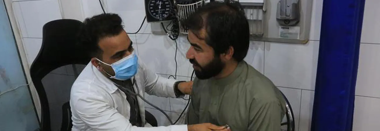 افغانستان کے دارالحکومت کابل کے افغان مرسی ہسپتال میں چین سے تعلیم یافتہ افغان ڈاکٹرشفیع اللہ احمد زئی ایک مریض کا معائنہ کر رہے ہیں۔(شِنہوا)