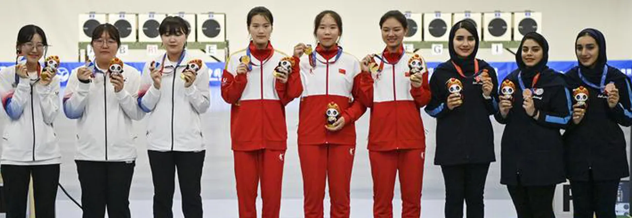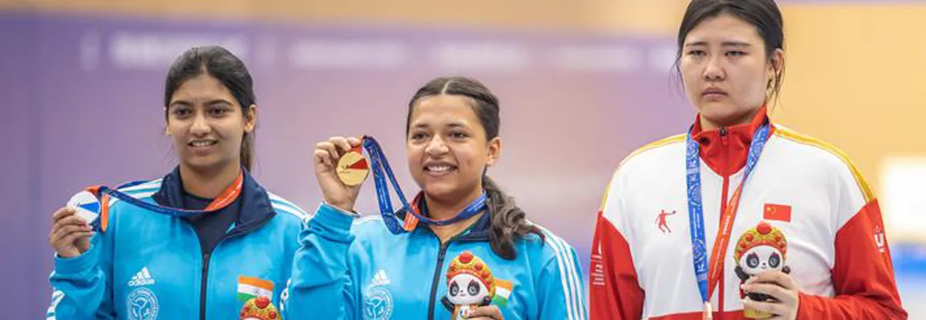چین کے صوبے سیچھوان کےشہر چھنگ دو میں31 ویں ایف آئی ایس یو سمر ورلڈ یونیورسٹی گیمز میں خواتین کے نشانہ بازی کے مقابلوں میں 50میٹررائفل 3 پوزیشن کی ایوارڈ تقریب میں طلائی تمغہ جیتنے والی بھارت کی صفت کور سمرا(درمیان)، چاندی کا تمغہ جیتنے والی بھارتی آشی چوکسی (بائیں) اور کانسی کا تمغہ جیتنے والی چین کھلاڑی وانگ زیرو  تصاویر کے لئے پوز دے رہی ہیں۔(شِنہوا)