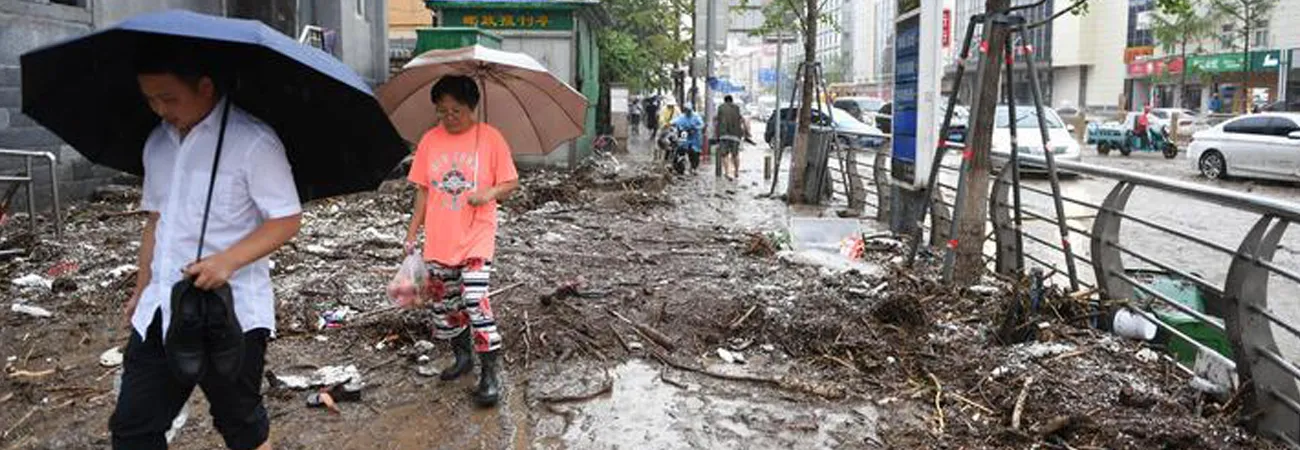 چین ، دارالحکومت بیجنگ کے سیلاب سے متاثرہ ضلع مینتوگو میں لوگ کیچڑ زدہ سڑک سے گزر رہے ہیں۔ (شِنہوا)