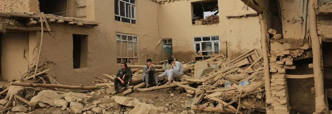افغانستان کے صوبہ وردک کے ضلع جلریز میں سیلاب سے متاثرہ علاقے میں لوگ تباہ شدہ مکان کے باہر بیٹھے ہیں۔(شِنہوا)