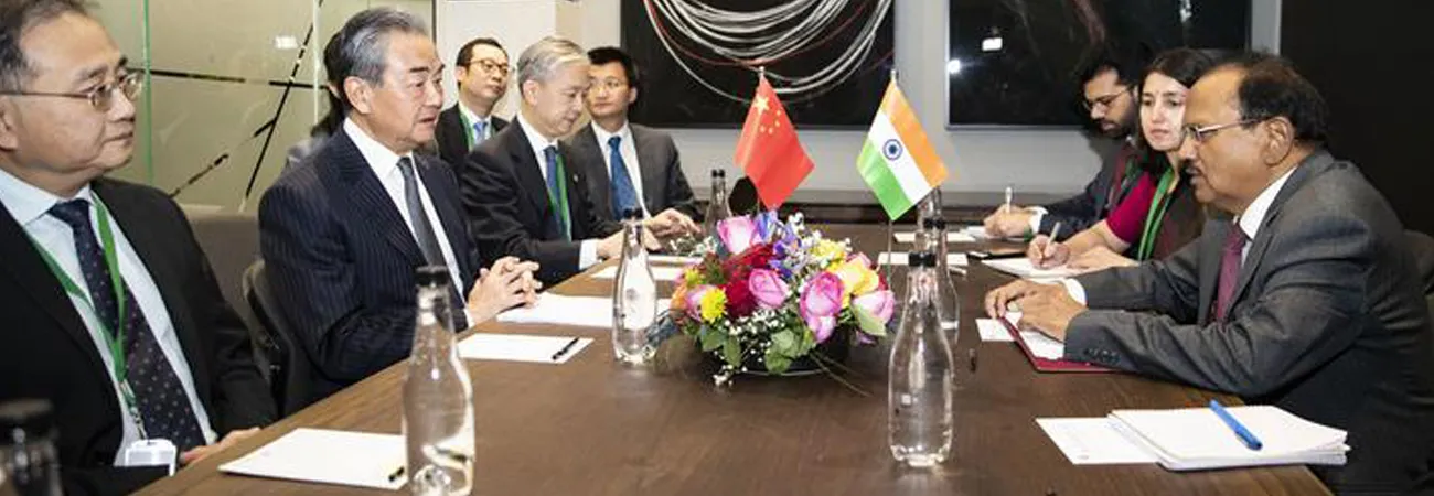 کمیونسٹ پارٹی آف چائنہ کے مرکزی کمیشن برائے خارجہ امور کے دفتر کے ڈائریکٹر وانگ یی (بائیں جانب دوسرے)جنوبی افریقہ کے شہرجوہانسبرگ میں بھارت کے مشیر قومی سلامتی اجیت ڈوول سے ملاقات کر رہے ہیں۔(شِنہوا)