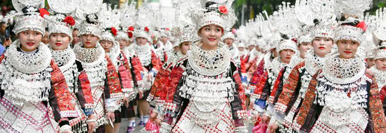 چین، جنوب مغربی صوبہ گوئی ژو کے چھیان ڈونگ یان میاؤ اور ڈونگ خوداختیارپریفیکچر کی کاؤنٹی تائی جیانگ میں منعقدہ ایک پریڈ کے دوران میاؤ نسل کی خواتین کو دیکھا جاسکتا ہے۔ (شِنہوا)