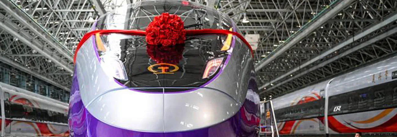 چین، شمال مشرقی صوبہ جیلن کے شہر چھانگ چھون میں ہانگ ژو ایشیائی کھیلوں کے لئے خصوصی طور پر تیار کردہ فوشنگ بلٹ ٹرین کا بیرونی منظر۔ (شِنہوا)
