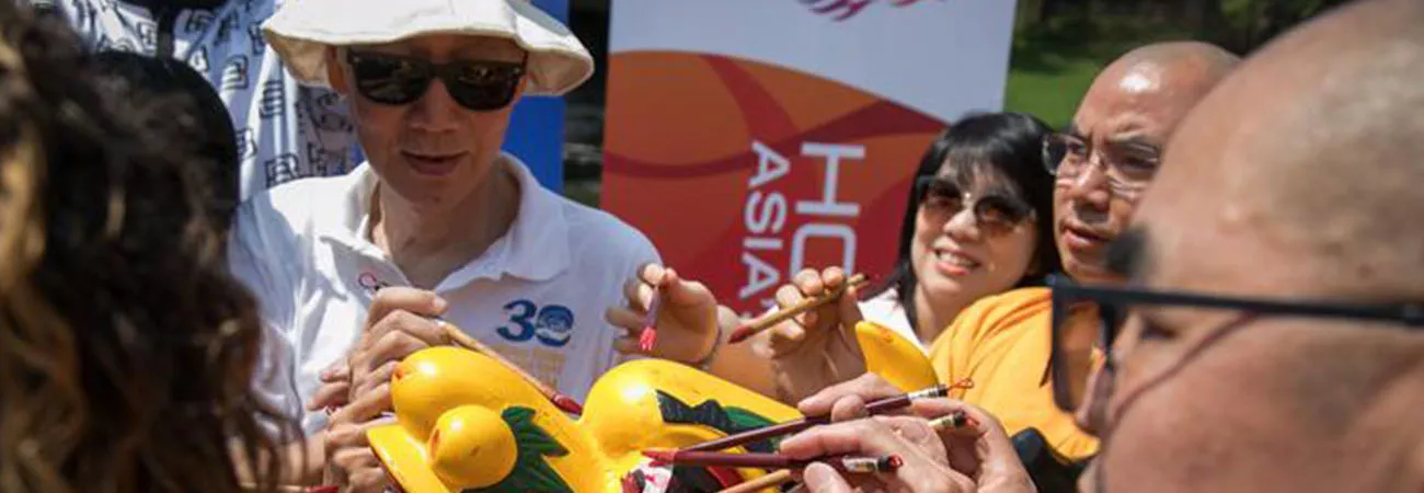 امریکہ ، نیویارک کے سینٹرل پارک میں ہانگ کانگ ڈریگن بوٹ فیسٹیول کی "ڈریگن آئی ڈوٹنگ" تقریب میں لوگ ڈریگن بوٹ کی آنکھوں میں نقش نگار بنارہے ہیں۔ (شِنہوا)