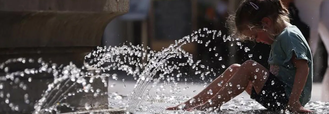 فرانس کے جنوبی مونٹ پیلیئرمیں پلیس ڈی کومیڈی پر ایک بچی تھری گریس فوارےسے ٹھنڈک حاصل کررہی ہے جہاں درجہ حرارت 38 ڈگری سینٹی گریڈ تک پہنچ گیا۔(شِنہوا)