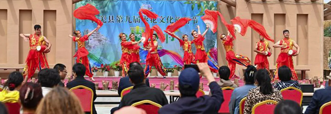 چین ، شمال مغربی سنکیانگ ویغور خوداختیار خطے کی کاؤنٹی روچھیانگ میں سیاحتی میلہ  کے دوران فنکار سیاحوں کے لئےفن کا مظاہرہ کررہے ہیں۔ (شِںہوا)