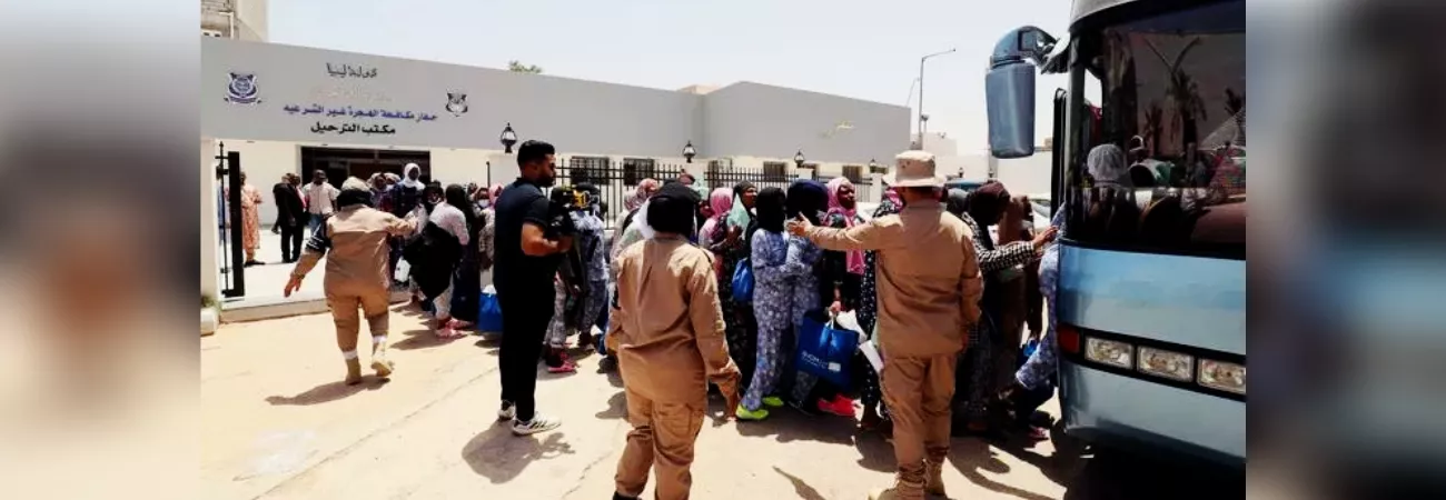 لیبیا، طرابلس میں ملک بدری آفس کے باہر غیرقانونی تارکین وطن ایک بس میں سوار ہورہے ہیں۔ (شِنہوا)