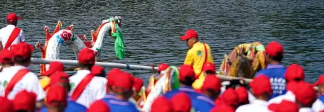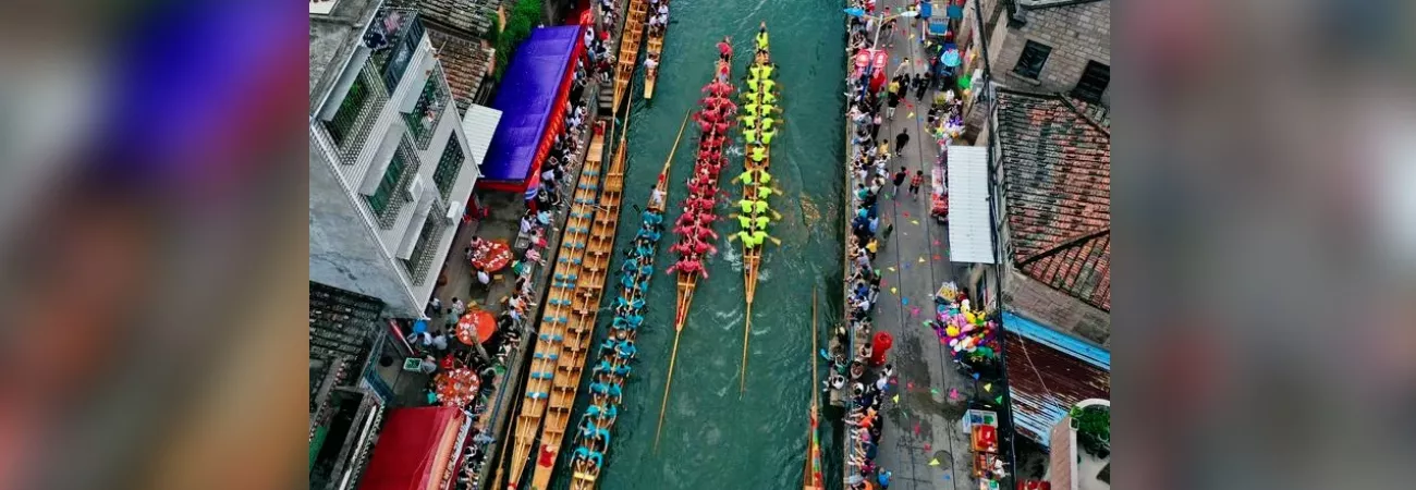 چین کے صوبہ آنہوئی کی کاونٹی جنگ شیان کےٹاؤن شپ تاؤہواتان میں ڈریگن بوٹس ایک ریس میں حصہ لے رہی ہیں جہاں اس سال کا تہوار 22 جون کومنایا جائےگا۔(شِنہوا)
