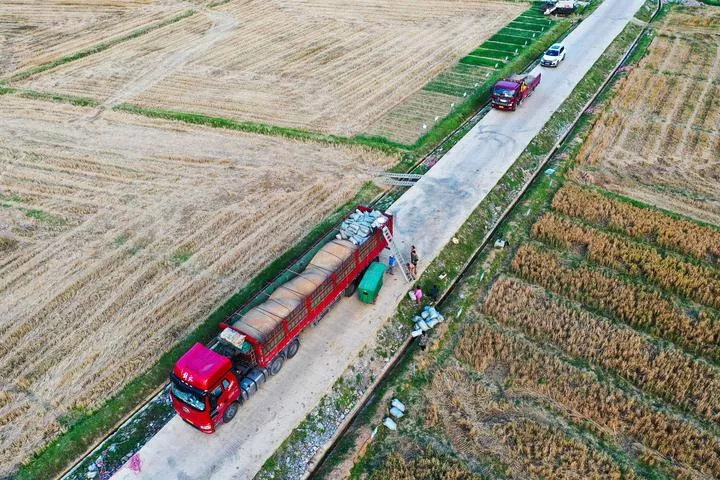چین کے صوبہ گوئی ژو کے شہر گوئی یانگ میں کائی یانگ کاؤنٹی کے گاؤں یان تانگ میں کسان کاٹی گئی نئی گندم کی بوریاں ٹرک میں لاد رہے ہیں۔(شِنہوا)
