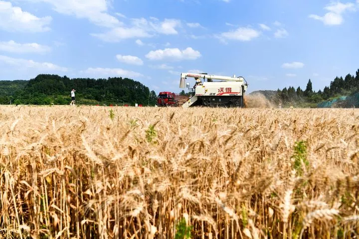 چین کے صوبہ گوئی ژو کے شہر گوئی یانگ میں کائی یانگ کاؤنٹی کے گاؤں یان تانگ میں فصل کاٹنے والی مشین گندم کے کھیت میں کٹائی کر رہی ہے۔(شِنہوا)
