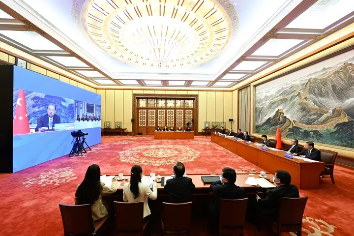 چین کی نیشنل پیپلز کانگریس کی قائمہ کمیٹی کے چیئرمین ژاؤ لیجی بیجنگ میں عظیم عوامی ہال میں ویڈیو لنک کے ذریعے آئس لینڈ کی پارلیمنٹ کے سپیکر برگیر آرمانسن سے بات چیت کر رہے ہیں۔(شِنہوا)