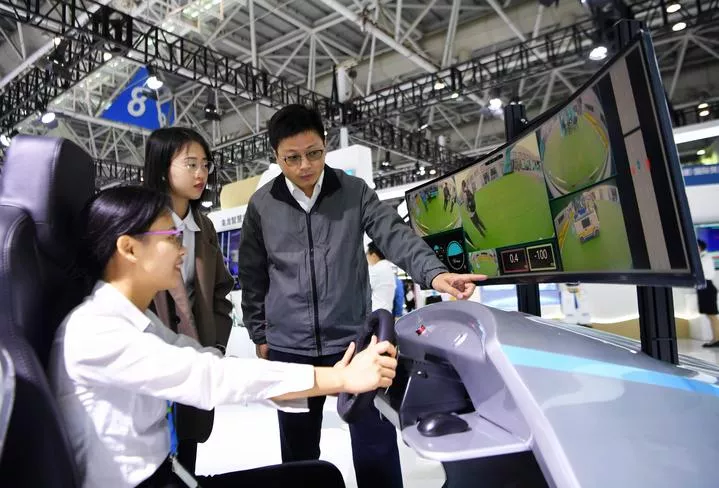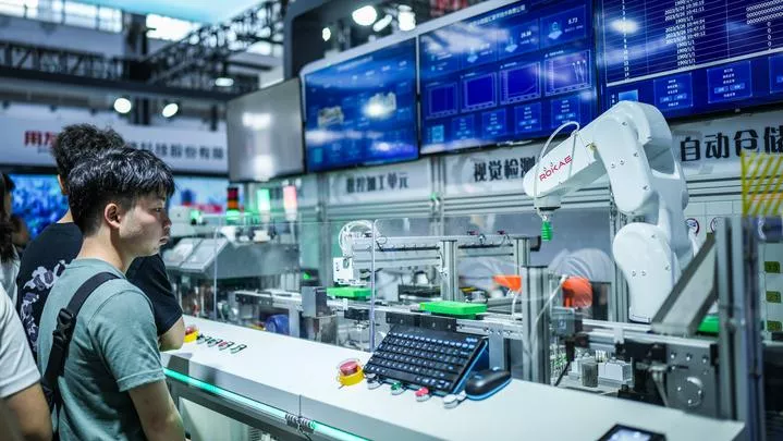 چین کے صوبہ گوئی ژو میں چائنہ انٹرنیشنل بگ ڈیٹا انڈسٹری ایکسپو 2023 میں لوگ ذہین مشینری کو دیکھ رہے ہیں۔(شِنہوا)