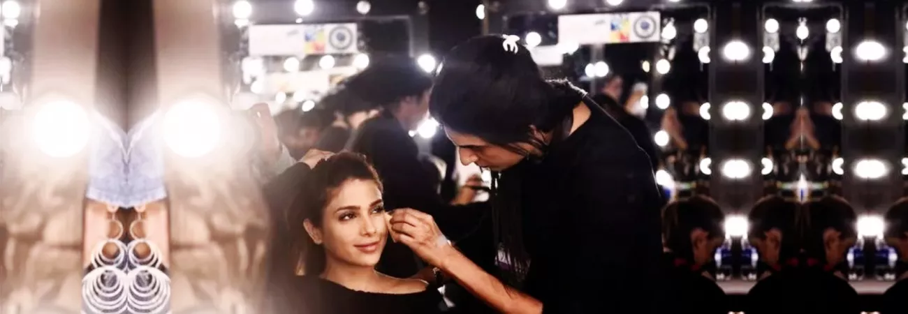 کراچی میں ٹریڈ ڈویلپمنٹ اتھارٹی پاکستان کی جانب سے منعقدہ فیشن شو سے قبل ایک میک اپ آرٹسٹ بیک اسٹیج پر ایک ماڈل کو تیار کررہی ہے۔ (شِںہوا)