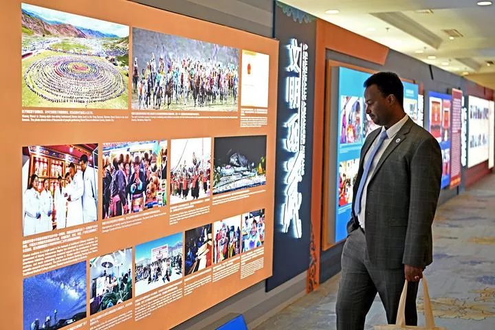 چین، دارالحکومت بیجنگ میں منعقدہ "شی زانگ ترقیاتی فورم 2023" کے مقام کے باہر ایک شخص نمائش دیکھ رہا ہے۔ (شِںہوا)