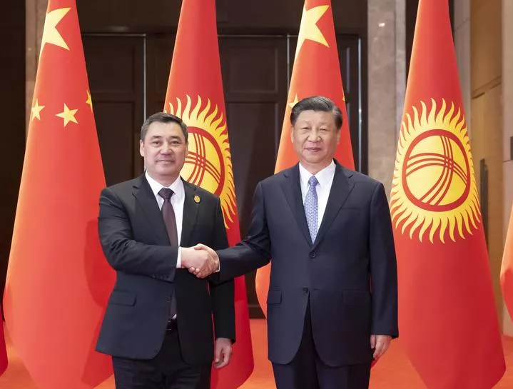چین کے صدر شی جن پھنگ چین وسطی ایشیا سربراہی اجلاس میں شرکت کیلئے چین کے دورے پر آئے کرغزستان کے صدرسردار جباروف سے بات چیت کے دوران مصافحہ کر رہے ہیں۔(شِنہوا)