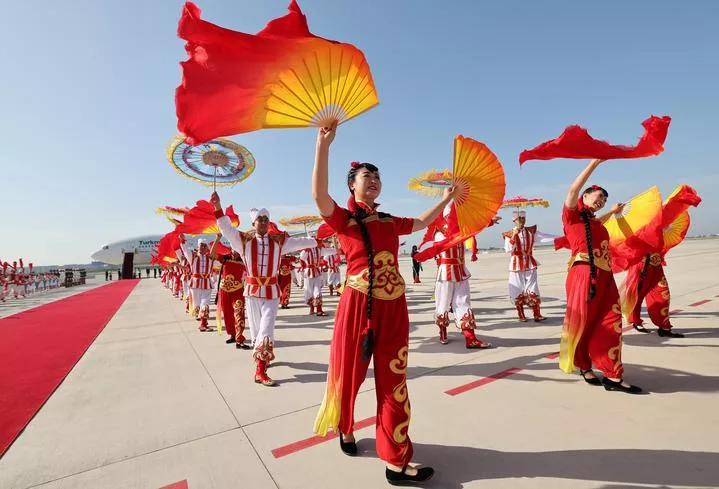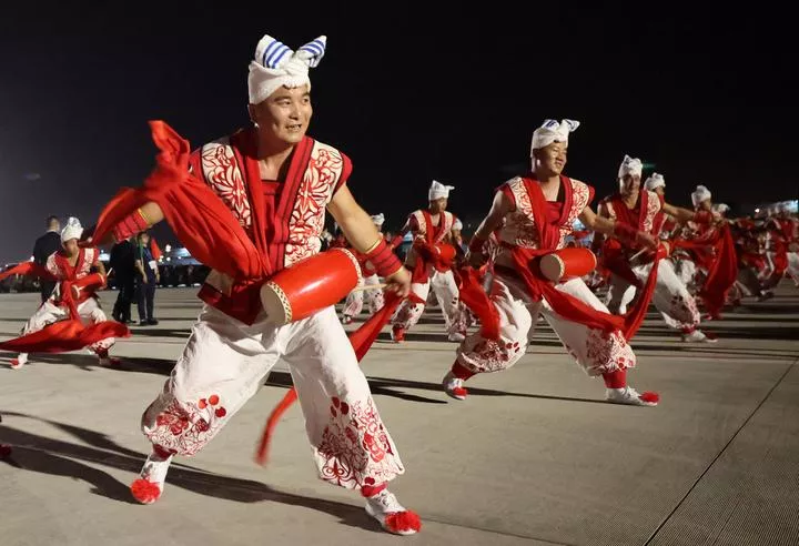 چین ، شمال مغربی صوبہ شانشی کے شہر شی آن میں شانشی کے لوک رقاص ازبکستان کے صدر شوکت مرزی یوف کی استقبالیہ تقریب میں فن کا مظاہرہ کررہے ہیں۔(شِنہوا)