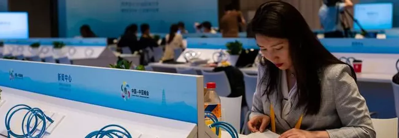 چین، شمال مغربی صوبہ شانشی میں منعقد ہونے والی چین ۔ وسط ایشیا سربراہ کانفرنس کے لئے قائم میڈیا مرکز میں ایک خاتون صحافی کام کررہی ہے۔ (شِںہوا)