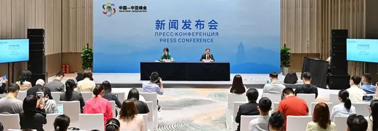چین کے شمال مغربی صوبہ شانشی کے شہرشی آن میں چین-وسط ایشیا سربراہ اجلاس کے بارے میں پریس بریفنگ کا منظر۔(شِنہوا)