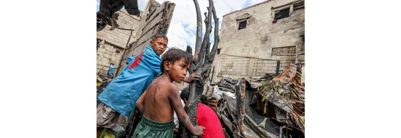فلپائن، منیلا کی ایک کچی بستی میں آتشزدگی کے بعد جلے ہوئے گھروں کے باہر بچے دیکھے جاسکتے ہیں۔ (شِنہوا)
