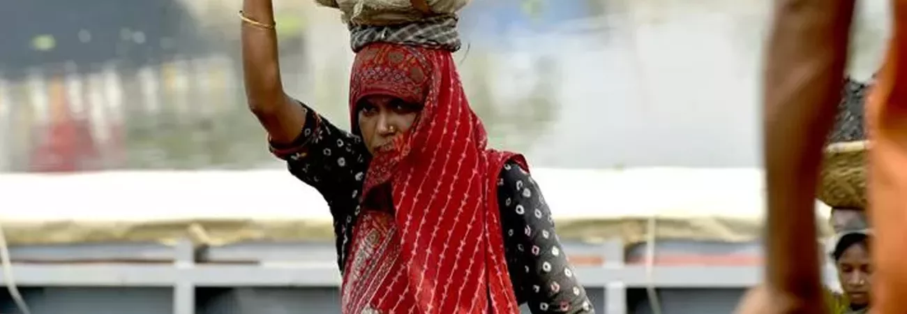 بنگلہ دیش کے دارلحکومت ڈھاکہ میں دریا کے کنارے پر ایک خاتون محنت کش کوئلے سے بھری ٹوکری اٹھائے ہوئے ہے۔(شِنہوا)