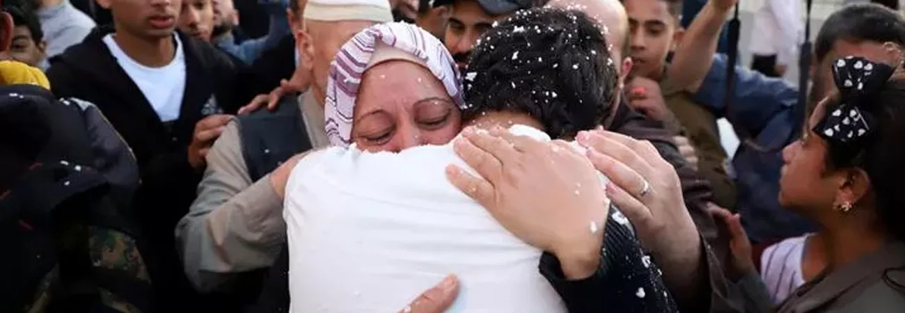 سوڈان سے نکالے گئے ایک فلسطینی کا  غزہ کی پٹی کے جنوبی شہر رفاہ میں سرحدی راہداری پر اس کے رشتہ دار استقبال کر رہے ہیں۔(شِنہوا)