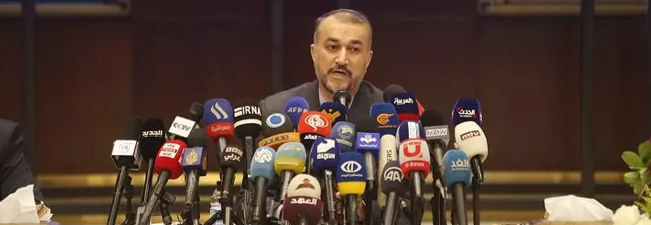 ایرانی وزیر خارجہ حسین امیر عبداللہیان لبنان کے شہر بیروت میں ایرانی سفارت خانے میں ایک پریس کانفرنس سے خطاب کر رہے ہیں جنہوں نےمشرق وسطیٰ کے ممالک کے حالیہ سیاسی میل جول کو خطے کیلئےنئے دور کا آغاز قرار دیا۔(شِنہوا)