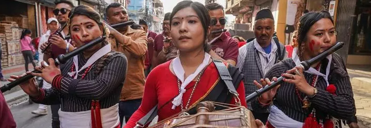 نیپال کے دارلحکومت کھٹمنڈو میں ایک ثقافتی میلے کے دوران نیواری لوگ روایتی موسیقی کے آلات بجا رہے ہیں۔(شِنہوا)