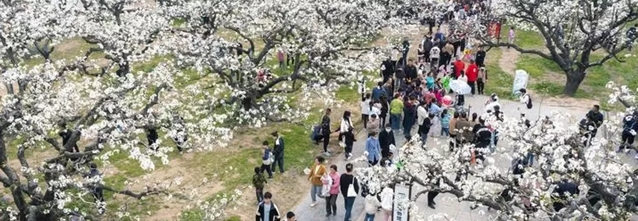 چین ، مشرقی صوبہ آنہوئی کے شہر سوژو کی کاؤنٹی دانگ شان میں ناشپاتی کے باغ میں سیاح ناشپاتی کے کھلتے پھول سے لطف اندوز ہورہے ہیں۔ (شِنہوا)