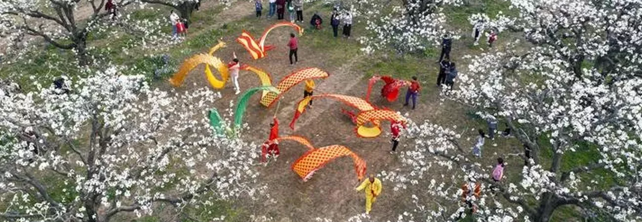 چین ، مشرقی صوبہ آنہوئی کے شہر سوژو کی کاؤنٹی دانگ شان میں ناشپاتی کے باغ میں سیاح لوک فن کا مظاہرہ دیکھ رہے ہیں۔ (شِنہوا)