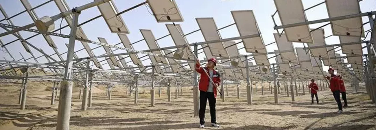 چین ، شمال مغربی ننگ شا ہوئی خوداختیار خطے کے ین چھوان میں تیز ہوا کے بعد ایک فوٹو وولٹک پاوراسٹیشن میں عملہ فوٹو وولٹک پینلز سے دھول صاف کررہا ہے۔(شِنہوا)