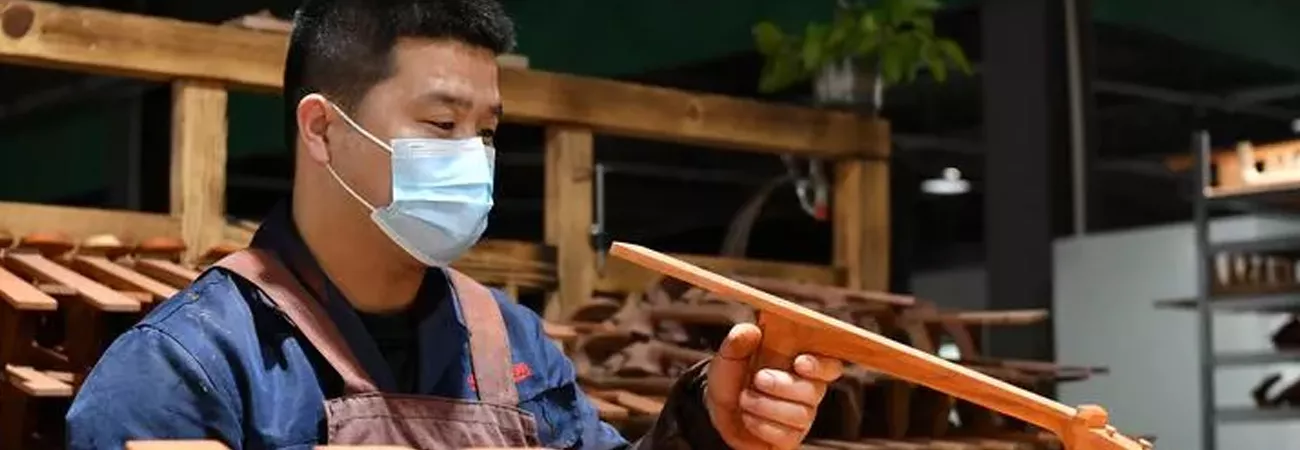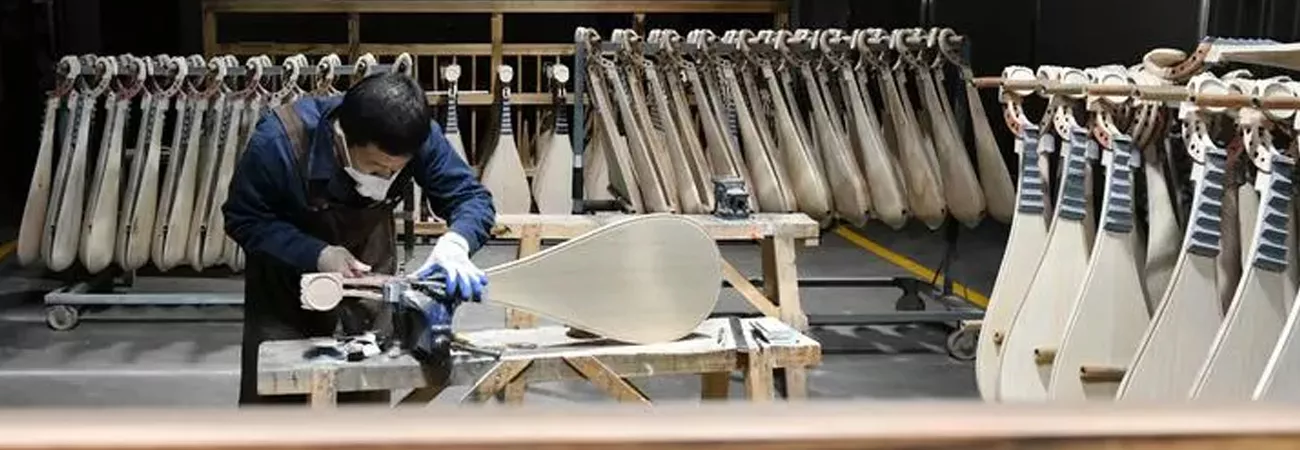 چین، شمالی صوبہ ہیبے کی کاؤنٹی سوننگ کی ایک ورکشاپ میں ایک محنت کش روایتی چینی آلہ موسیقی کے پرزے  تیار کررہا ہے۔ (شِںہوا)