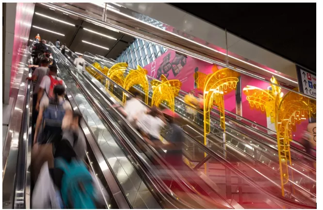 ملائیشیا، کوالالمپور میں پاسر سینی ایم آر ٹی اسٹیشن پر  مسافر "سنی سائیڈ اپ" آرٹ تنصیب  سےگزر رہے ہیں۔(شِنہوا)