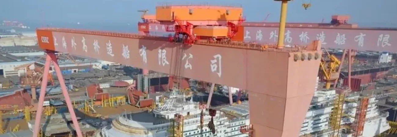 چین، مشرقی شہر شنگھائی میں شنگھائی وائی گاؤ چھیاؤ شپ بلڈنگ کارپویشن شپ یارڈ میں دیوقامت کروز لائنر کو دیکھا جاسکتا ہے۔ (شِںہوا)