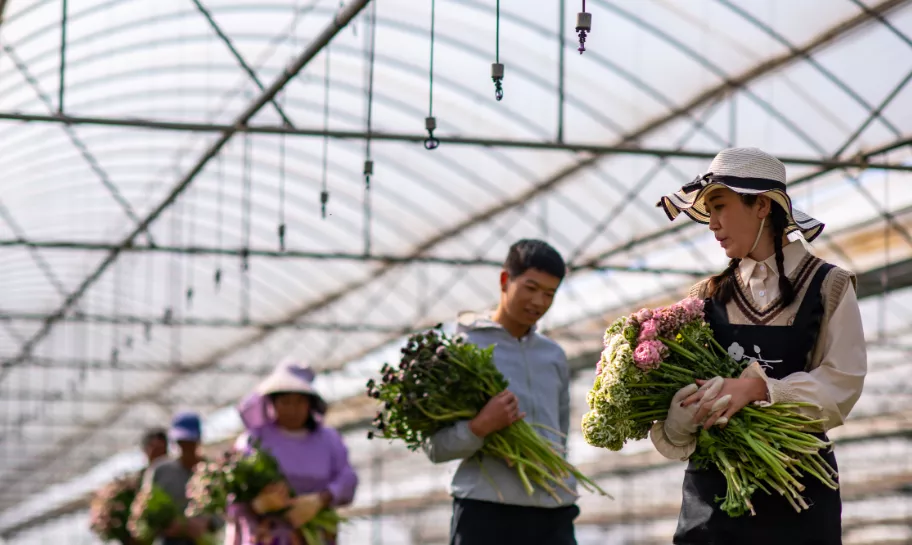 چین، جنوب مغربی صوبہ یون نان کے چھوجنگ میں بی شی شی (پہلی دائیں) اور خاندان کے ارکان  پیکنگ سے قبل پھولوں کے اپنے کھیت سے تازہ پھول منتقل  کررہے ہیں۔ (شِنہوا)