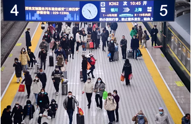 چین کے شمال مغربی صوبے  شانشی  کے شہر شی آن کے ریلوے اسٹیشن پرمسافروں کی آمدورفت کا منظر۔(شِنہوا)
