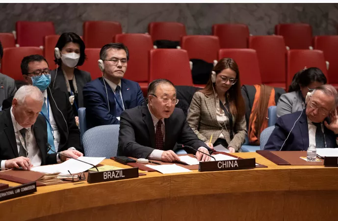 اقوام متحدہ میں چین کے مستقل نمائندے ژانگ جون (پہلی قطارکے درمیان)"سمندر کی سطح میں اضافہ: بین الاقوامی امن وسلامتی کے لیے مضمرات" کے موضوع پر سلامتی کونسل میں ہونے والی بحث  میں حصہ لیتے ہوئے۔(شِنہوا)