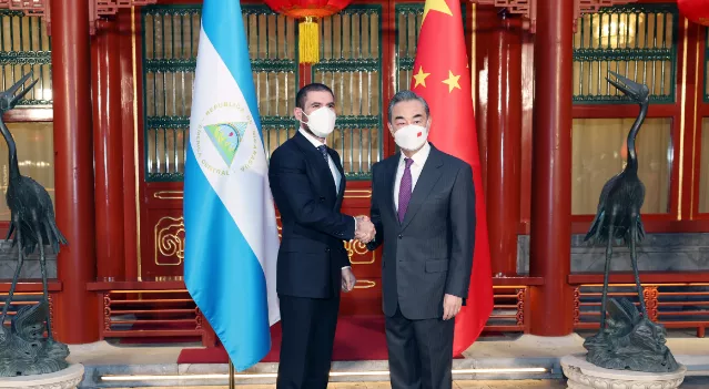کمیونسٹ پارٹی آف چائنہ (سی پی سی) کی مرکزی کمیٹی کے سیاسی بیورو کے رکن اور سی پی سی مرکزی کمیٹی کے خارجہ امور کمیشن دفتر کے ڈائریکٹر وانگ یی بیجنگ میں  نکاراگوئے کے صدارتی دفتر میں سرمایہ کاری، تجارت اور بین الاقوامی تعاون کے مشیر لوریانو اورٹیگا سے ملاقات کرتے ہوئے۔(شِنہوا)