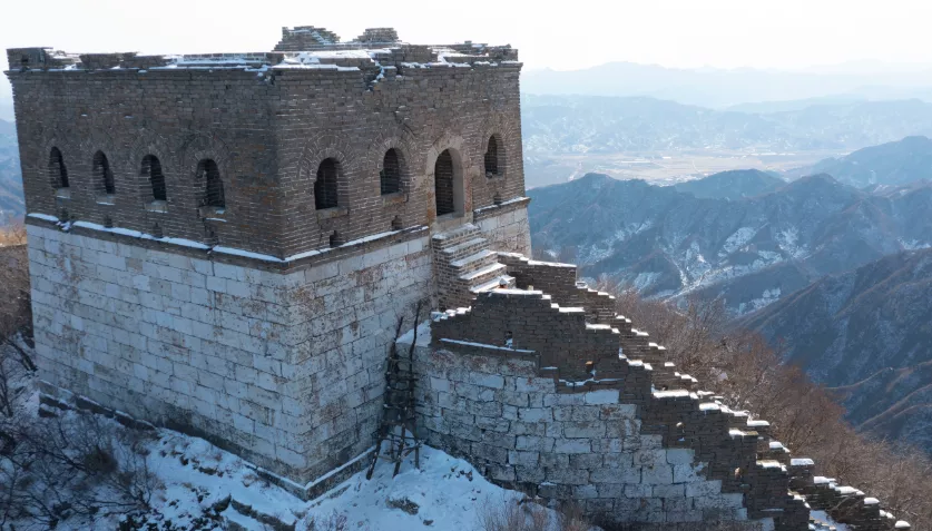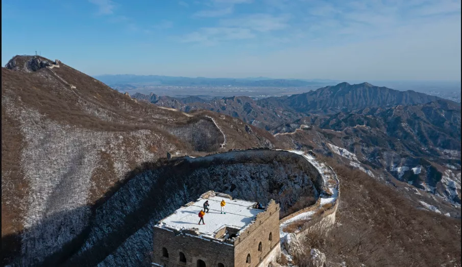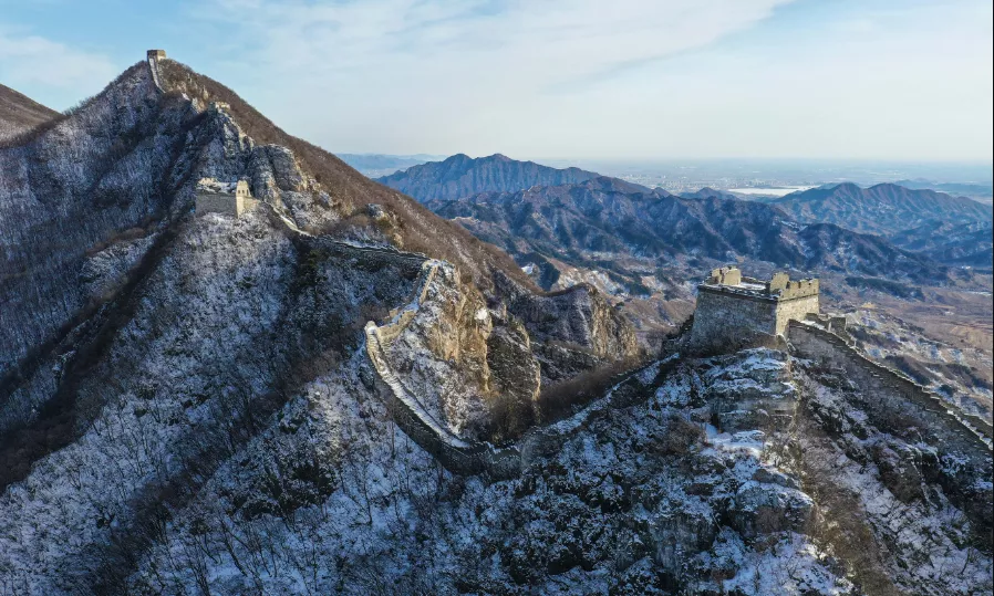 چین ، دارالحکومت بیجنگ میں عظیم دیوار چین کے جیانکو حصے پر برف کا دلکش نظارہ۔ (شِںہوا)